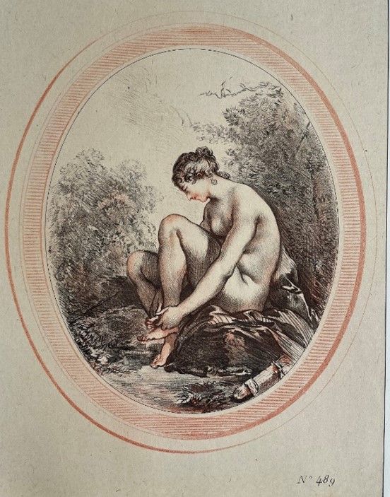 Femme se lavant les pieds (aux deux crayons). Il s’agit de la 18ème lithographie du premier recueil réalisé par William Thornley d’après François Boucher en 1881. La lithographie est numérotée 489 en bas et à droite du visuel. Dimensions : planche, H.44,5 cm x L.31,5cm ; visuel, H.26cm x L.19,5cm.