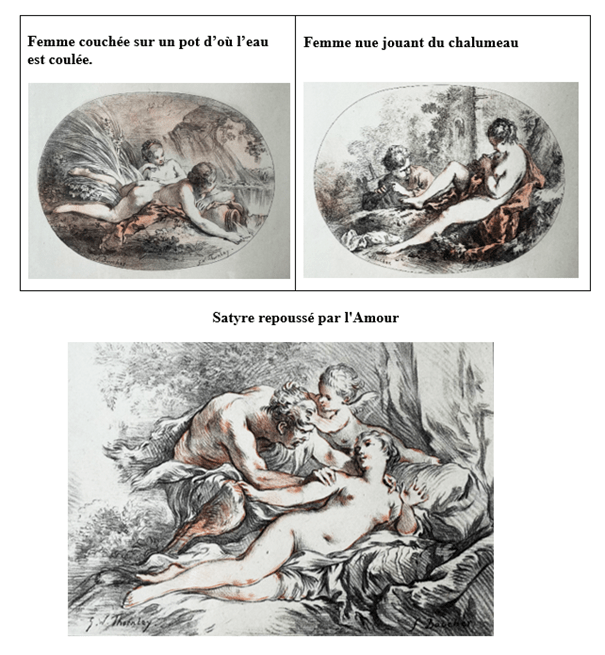 Les trois oeuvres exposées ci-après (13,19,21), et reprises par William thornley en 1881, avaient déjà été gravées du vivant de François Boucher par le Graveur Liégeois Gilles Demarteau (1722-1776)