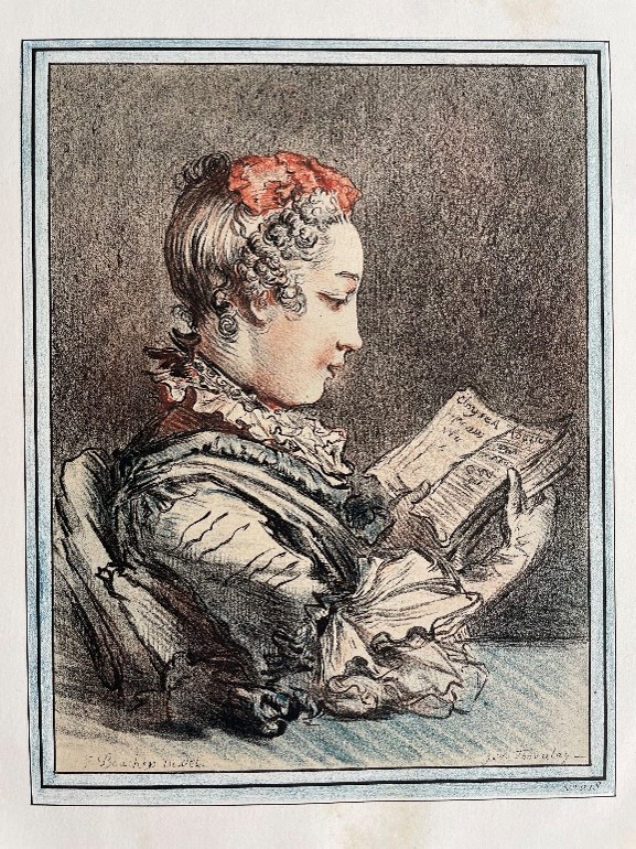 Jeune femme lisant la nouvelle Eloïse (Planche : H, 44,5cm; L, 31,5cm,. Visuel: H, 21,5cm; L,16,5cm). Lithographie signée « G.W.Thornley » en bas et à droite dans la gravure, et numérotée 218. L’une des 25 lithographies du premier recueil réalisé par William Thornley en 1881, d’après François Boucher (1703-1770), selon la manière des trois crayons. A l’instar … Lire la suite
