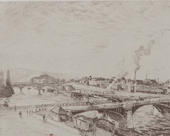 Ponts à Rouen Lithographie de William Thornley (1857-1935) d’après Camille Pissarro (1830-1903). Origine du visuel : INHA (0618_doucet_FEST617) – Sous licence ouverte. Il s’agit de la 23ème planche de l’album édité chez Hessèle en 1900 et imprimé en 108 exemplaires par R. Engelmann (Atelier Belfond). Dimensions de la vue : 20,7cm x 26,5cm. William Thornley a réalisé … Lire la suite