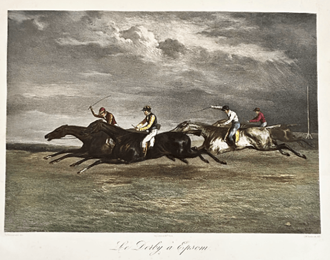 Le Derby à Epsom (1883). Visuel (CAT 45 n°224) présenté avec l’aimable autorisation de la Galerie d’estampes Martinez à Paris. Epreuve sur papier chine appliqué, imprimée par Lemercier & Cie à Paris et publiée chez Charles Delorière, 15 rue de Seine à Paris. Cette lithographie (29,9cm x 63,2cm), réhaussée en couleurs et gommée, a été … Lire la suite