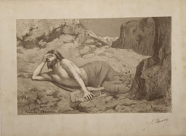 Orphée (Collection privée). Probablement entre 1883 et 1889 .Visuel et informations présentées avec l’aimable autorisation de son propriétaire. Lithographie de William Thornley d’après Puvis de Chavannes (1824-1898). Imprimée dans un ton sépia, sur chine appliqué sur vélin blanc épais, elle porte la signature de l’artiste au graphite.  Dimensions de l’image : 16,5cm x 26,6cm ; de la … Lire la suite